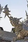 The principal building, the ubosot, is an all-white building with fragments of mirrored glass embedded in its exterior. It embodies design elements from classic Thai architecture, such as the three-tiered roof and abundant use of Nāga serpents.[5] "Inside the temple, the decor swiftly moves from pristine white to fiery and bewildering. Murals depict swirling orange flames and demon faces, interspersed with Western idols such as Michael Jackson, Neo from The Matrix, Freddy Krueger, and a T-800 series Terminator. Images of nuclear warfare, terrorist attacks such as the World Trade Center attack, and oil pumps hammer home the destructive impact that humans have had on earth. The presence of Harry Potter, Superman, and Hello Kitty confuses the message somewhat, but the overall moral is clear: people are wicked.[8]