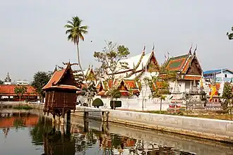 Today, the temple is particularly known for its historic architecture, including the old murals in the ordination hall (ubosot), the scripture library (ho trai) elevated on three stilts above a pool, and the teak sermon hall (sala kan parian). The last is recorded as having been donated by Phrachao Suea, the King of Ayutthaya, to the supreme patriarch Somdet Chao Taengmo, who had studied at the temple and significantly expanded it in the early 18th century.[1][2][3]