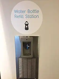 Newer variants of water coolers include an additional dispenser designed to fill water bottles directly on wall-mounted units. This is increasingly common in public water coolers as they have also been spotted in public places such as airports[6][7] and railway stations.[8] These bottle filling units also can indicate the number of single-use plastic bottles saved as part of an ongoing public effort to reduce plastic pollution.