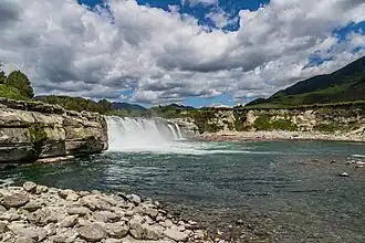 New Zealand has many notable waterfalls, some of which are regularly visited by tourists. Huka Falls on the Waikato River is one such waterfall. Sutherland Falls is usually regarded as the highest waterfall in New Zealand at 580 metres high but Browne Falls cascades 619 m or 836 m depending on what is considered to be the source. The Maruia Falls on the Maruia River are a relatively new waterfall formed as a result of the 1929 Murchison earthquake.[6]