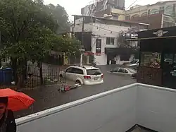 The Mexico Valley Basin has faced droughts, recurrent floods and other hydrological and climate-related hazards since pre-Hispanic and colonial times.[18] It is particularly vulnerable to floods because it is a naturally enclosed basin[19] and because very few natural drainage basins remain, as many of the aquifer system streams and rivers have either dried up or encased and converted into sewers.[18] The hydrological cycle used to be in equilibrium; elevated mixed forests interacted with infiltration, evapotranspiration, and with the system of rivers, seasonal streams and lakes that acted as watersheds, or drainage basins, for precipitation runoff.[18] The monsoon season is characterized by high intensity storms of short duration, averaging 800 mm of annual precipitation (although this spreads differently by region: 500 mm in the east and 1000 mm in the west and south).[19] Additionally, the high speed at which abundant surface runoff runs down the valley's slopes poses a big risk for nearby populations.[20]