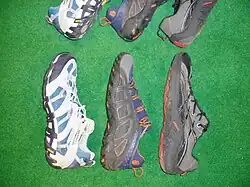 A water shoe is a type of footwear that is typically used for activities where the feet are likely to become wet, such as kayaking. Water shoes are usually made of mesh and have a hard sole used to prevent cuts and abrasions when walking in wet, rocky environments. They may often have tiny holes on the bottom or sides of the sole to allow for quick water drainage, which helps the wearer's feet dry faster, keeps the shoe light, and prolongs the lifespan of the material. Additionally, most people do not wear socks with water shoes.