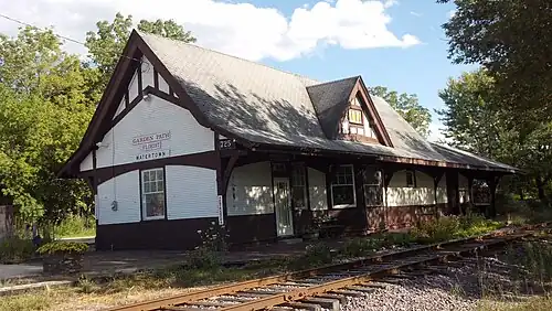 The Watertown Depot in Watertown, Wisconsin, United States, is a railroad depot built in 1903 and operated by the Chicago and North Western Railway and the Milwaukee Road.[2] The station served passengers from 1903 to June 1950.[3] Afterwards, it serviced freight trains until 1976. It has since been converted into a florist shop, and most recently, a used car dealership.[4] The Union Pacific Railroad's single-tracked Clyman Subdivision remains in front of the depot. The Canadian Pacific Kansas City’s main line is to the right.