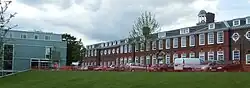In recent years the school has built a gym, a music block (also partly owned by Hertfordshire School of Music) and a Sixth Form centre with a food technology lab, financed through fundraising and the sale of land on the northern edge of the grounds for residential development.[15] The school's music block, the "Clarendon Muse", stands on the front lawn of the school.[16] The building was completed in December 2007 at the cost of £5 million, and has approximately 2,000 square metres (22,000 sq ft) of space spread out over four floors.[15] It is also used by the Hertfordshire School of Music in the evenings and weekends.[17][18]