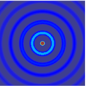 Cut-away of spherical wavefronts, with a wavelength of 10 units, propagating from a point source