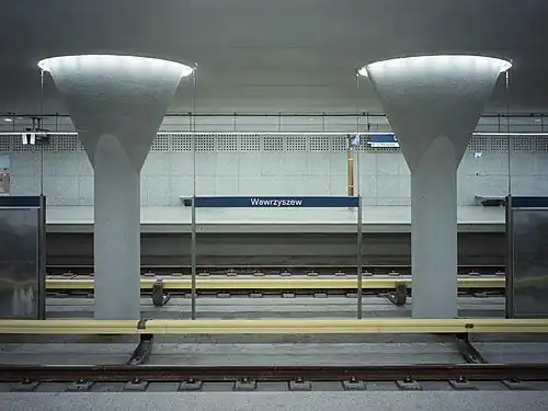 Metro Wawrzyszew, located at the corner of Kasprowicza and Lindego Street, became the 20th working station on Line M1 of the Warsaw Metro when it opened on 25 October 2008 as part of the extension from Słodowiec to Młociny.[1] It was designed by Polish architect Andrzej M. Chołdzyński.[2]