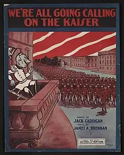 We're All Going Calling on the Kaiser is an American World War I era song written by Jack Caddigan and James A. Brennan, published by Leo Feist on February 16, 1918.[1][2] The humorous song declared "We've got to teach the Kaiser to be wiser," with couplets like "And we'll bring him something good / A kimono made of wood."[3] The song was recorded on Columbia records by Arthur Fields and Peerless Quartette[4] and on Victor by William J. ("Sailor") Reilly.[5]