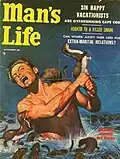 The two images that inspired the cover art by Neon Park: the September 1956 cover to Man's Life magazine (left) and a 1953 Schick electric shaver ad (right).