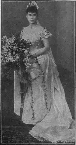 In 1891, the bride's mother, the Duchess of Teck, had declared that her daughter's wedding dress and those of her bridesmaids would be manufactured entirely in Britain. This was likely because the Duchess was president of the Ladies' National Silk Association.[3][4] Upon the announcement of the engagement of Princess May (as she was usually known) to Prince George, Duke of York in the spring of 1893, Arthur Silver (of the Silver Studio), was approached to design the gown. Silver had designed the dress for Princess May's intended wedding to George's older brother, Prince Albert Victor, Duke of Clarence and Avondale, in 1892. This 'Lily of the Valley' creation had been made public just days before the Duke of Clarence's untimely death in January 1892 but had to be completely abandoned.[5] The design chosen for the York-Teck wedding was 'The May Silks'; the dress would feature embroidery of the emblems of a rose, shamrock and thistle, and be trimmed with the traditional orange blossom and true lovers knots.[3] Silver, renowned for his Art Nouveau designs, was also said to be much influenced by Japanese art in his design.[4] In March 1893, the Duchess and Princess visited the Warner & Sons' factory at Hollybush Gardens in Spitalfields,[6] London and commissioned them to make the finest white silk with silver thread by Albert Parchment in time for the July wedding.[3]