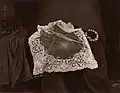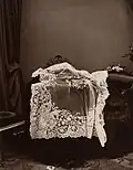 Victoria also wore her wedding lace mounted on the dresses she wore to the christenings of her nine children (except for Albert Edward's, for which she wore her Garter robes).[18][19] She also wore it to the weddings of two of her children, her eldest daughter, Victoria, in 1858,[18] and her youngest son, Leopold, in 1882.[20] Her youngest daughter, Princess Beatrice, was permitted to wear it as part of her wedding gown in 1885.[21] Victoria also wore the lace to the wedding of her grandson George (the future George V) to Mary of Teck in 1893,[22] and for her Diamond Jubilee official photograph in 1897.[23] When Victoria died, she was buried with her wedding veil over her face.[24] In 2012 it was reported that while the dress itself had been conserved and displayed at Kensington Palace that year, the lace was now too fragile to move from storage.[9]