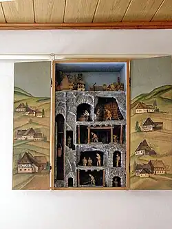 A Weihnachtsberg is a decorative, mountain-like model of the landscape of the Ore Mountains (between Germany and the Czech Republic), which is set up indoors during the Christmas period.[1] It portrays the nativity scene and mining motifs as well as local themes. The figures and objects are often movable and mechanically driven.