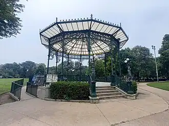 A prominent feature is the European-style wrought iron gazebo on the park’s west side, used as a performance venue for concerts and community gatherings.[11] The structure is wired for electricity, supporting lighting and sound equipment, frequently used for the park's Tuesdays at the Gazebo concert series taking place annually since 1994.[12]