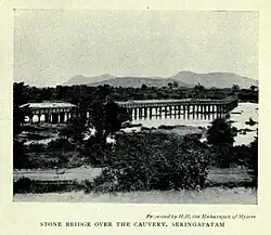 Wellesley Bridge, Srirangapatna is an ancient stone bridge built in 1804 on the Highway road leading to Bengaluru from Mysuru in the state of Karnataka. This stone bridge is built across the north bank of the Cauvery River (also spelled Kaveri River). When built it was the main first artery approach to the island town of Srirangapatna (also known as Seringapatam during British Raj) which was initially the capital city of the Wodeyar Dynasty of Mysore Kingdom after the death of Tipu Sultan in 1799. The bridge was dedicated to Marquis Wellesley who was the Governor-General of British India when it was completed, and it was inaugurated in October 1804. It was built under the overall supervision of Dewan, Purnaiah of the Kingdom of Mysore, as directed by the King Mummadi Krishnaraja Wodeyar.