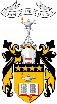 The coat of arms of Wellington College is based on that of Bernard Freyberg, charged with an oil lamp, used on the seal of the college since 1873,[26] and a book, representing knowledge. The five plates on the bookmark come from the coat of arms of the Duke of Wellington. The sallet is a type of helmet usually granted to corporate bodies in Scottish heraldry.[27]