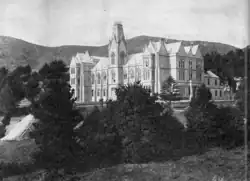 Wellington College opened in 1867 as Wellington Grammar School in Woodward Street, though Sir George Grey gave the school a deed of endowment in 1853. In 1869 the school moved to a new, spired, wooden building on the hills above the central city in Clifton Terrace from where it could be seen from many places in Wellington.[4] In 1874 the college opened in a much larger building at its present location.[5] The former boarding establishment at the College, Firth House, was named after Joseph Firth, the headmaster from 1892 to 1921.[6]