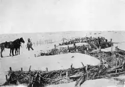 On 21 August the regiment moved back to "Big Table Top" for the pending assault on Hill 60. The attack, at 15:30, succeeded in capturing around two hundred yards (180 m) of Turkish trenches. Two days later, at 17:15, the regiment was relieved and rejoined the brigade at Kabak Kuyu, but at 19:30, five officers and 125 other ranks had to return to the front to defend the western slopes of Hill 60. The same day, three officers and seventy-seven other ranks arrived as reinforcements for the regiment.[38] On 25 August those men still at the front were relieved by the Canterbury Mounted Rifles and Otago Mounted Rifles, in preparation for a night assault on Hill 60 by the brigade. The assault was postponed for two days to rest the men. Although the brigade was responsible for the centre objective during the assault, it could only provide three hundred men, with another one hundred men coming from the Australian 18th Battalion. The regiment's contribution was five officers and 125 other ranks. The battle commenced with an hour-long artillery bombardment. The Auckland and Canterbury Mounted Rifles formed the first line of attack, the Wellington regiment and the Otago Mounted Rifles the second, and the Australians made up the third line. At 17:00 the attack began, and despite taking heavy casualties crossing no man's land, the first Turkish line was captured. The Wellington regiment and Otago Mounted Rifles continued on, took out a machine-gun post and captured the second Turkish trench, but sustained heavy casualties.[35][39][40] On the other flanks the supporting assaults had failed, leaving the regiment and the Otago Mounted Rifles isolated on a narrow front. The brigade therefore consolidated the ground already captured and moved forward their machine-guns to support the defence; the forward defensive line was only forty men. The regiment's casualties during the battle were fifty dead and fifty-nine wounded.[41] That night the remainder of the regiment moved into the front line. They fought off several counter-attacks, losing another man killed and eleven wounded.[42] On 29 August the regiment was relieved by the 163rd (Norfolk & Suffolk) Brigade, but remained in the reserve trenches for the next three days. Even there the number of casualties continued to increase, so that by 2 September there were only six officers and ninety-nine men left in the regiment. Despite this, they still had to supply five officers and thirty-nine other ranks to occupy a trench on "Cheshire Ridge".[43]