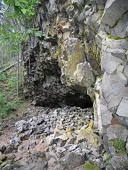 Eruptions near Ray Lake built a cinder cone known as Dragon Cone and concluded with an approximately 16 km (9.9 mi) long ʻaʻā lava flow that has been radiocarbon dated at about 7,600 years old.[1] This lava flow, known as "Dragon's Tongue", is at least 15 m (49 ft) thick at the proximal end, but thins to 3 m (9.8 ft) at the distal end, damming the southern end of Clearwater Lake.[4] Tree molds are maintained within the lava flow at the lower end.[6]