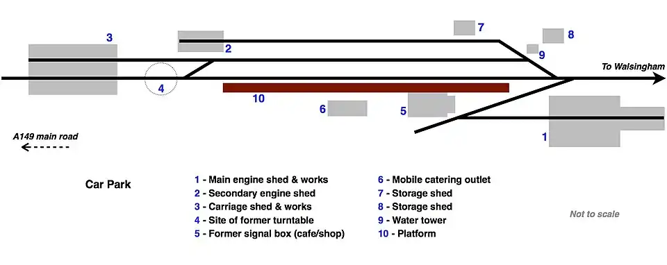 Passenger facilities consist of a single rail-level platform, a large car park, toilets (near the car park), and the ground floor of a formerly redundant signal box moved from Swainsthorpe to Wells, wherein a souvenir shop and tearoom are now situated, together with waiting room facilities.