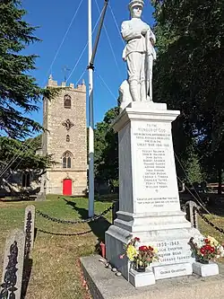 The war memorial in St Mary's churchyard was ceremoniously erected in 1923 to commemorate the men who died fighting in World War I. It was unveiled by Col Herbert Gordon on 26 May 1923 to a crowd of Weltoners, with prayers by the Rev T Naylor, followed by the dedication by the Venerable Archdeacon Blackie, and singing. The memorial was made by A J Tuttell and son of the Monumental Masons in Lincoln, and George William Beeton (1890–1966) was photographed by J Spencer Baldry of Lincoln as a model for masons to use in the making of Welton's war memorial. Memorials using the same reference have since been erected in various villages in Lincolnshire, including Haxey and Metheringham, as well as possibly Soham in Suffolk nearby his hometown,[45] and was also notably used for the memorial that was damaged by the IRA in Enniskillen in 1987.[35][46][47]