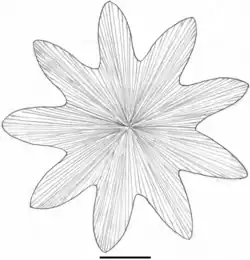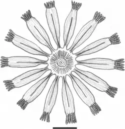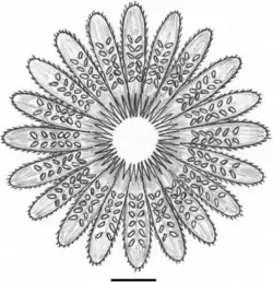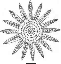 Although the morphology of Weltrichia is highly variable, the overall morphology consists of a central cup-like structure surrounded by a number of radially symmetrical outward projecting rays, to which are attached bivalve-shaped pollen sacs/synangia. The number of rays varies from 9/10 to 30, depending on the species, and the total diameter from 3 centimetres (1.2 in) to over 20 centimetres (7.9 in). Both the cup and rays usually (but not always) have substantial thickness, in some of the thicker species the structure is noticeably woody. The pollen is monocolpate and elliptical. In some species, additional rays project over the central cup, and attractants/resinous substances are present within the cup. The rays also sometimes have ridges, trichomes, appendages, striae and/or unipinnate (pedicellate) pollen sacs present. Species of Weltrichia appear to have primarily been wind pollinated, though some species may have been pollinated by insects, such as beetles. They were borne by the same plants that also bore female ovulate cones assigned to Williamsonia.[1] It is unclear whether the parent plants were monoecious (having both structures on one plant) or dioecious (where each plant only has one gender of reproductive organ). At least some bearers of Weltrichia, such as Kimuriella from the Late Jurassic of Japan were low growing divaricately branching shrubs with a maximum height of 2–3 metres, while others such as Williamsonia gigas may have been more cycad-like in morphology.[2]