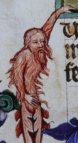 Hairy figures known as Wild Men preside throughout the margins of the Wenceslas Bible. Medieval art historians such as Studnickova and Antunes have done extensive research regarding the "Wild Men" found as a motif in Medieval art. The Wild Men are figures covered in hair from head to toe, sometimes bald or combed, with human faces.[3] While unique in depiction, they come from a heritage of depiction from more pagan mythos such as Satyrs.[3] Sometimes called Green Men in other contexts, they can refer to a representation of the anxieties faced while traveling through the wilderness during important travel such as a pilgrimage.[3] During travel through this wilderness, people could expect to find a variety of individuals on the outskirts of society such as highwaymen or pagan cultists, allowing this artistic depiction of Wild/Green Men to stand in for their fears of confrontation to these people during this travel.[7][8] While there are definitely cases where Lords or other landowners had more of a direct control over these wild areas if there was something produced in these areas such as beeswax, it was within these forests that provided an opportunity for a shift within the social-hierarchy of the time. Somebody who may be poor and unimportant in a more rural area had the opportunity to wield power through violence over travelers through this undeveloped land.[7] Again, as a general motif found in various European cultures, the Wild Men began to represent a variety of things, in this case the anxiety of encountering someone who may trick or hurt you in an unfamiliar area.[7]