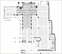 The building is in a toned-down Gothic Revival style, built of red brick with tracery and mullion details in white stone or stucco. It was designed by David McLeod Craik of Swan and Maclaren.[5] The interior originally consisted of a nave and two transepts, with a wooden hammerbeam roof. The church was extensively remodelled and extended in 1977 and 1988, doubling the length of the nave. Aisles were also provided by turning the original windows into arched openings and extending the roof. Additional rooms were created in extensions to the transepts, and a new building containing a multi-purpose hall and more rooms constructed beside it. This building was decorated in the same colour scheme as the original church, but with few other similarities. While the capacity of the church was greatly increased, the building lost most of its original façades, as well as much (if not most) of its original exterior appearance. Seemingly oddly-placed gothic finials emerging from the tiled roof indicate where the original façades once were. Although the new construction used the same combination of brick and plaster as the original structure, it is quite utilitarian and lacks the details and grace of the original, both on the exterior and interior. For instance, the new portion of the nave has a plain pitched roof without the carved wooden hammerbeams in the older portion, and the placement of windows and other openings bears no relation to the original structure.
