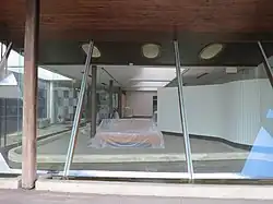 In 2008, architect Robert Riddel purchased the building and carried out extensive renovations and conservation work.[114] This was completed with the guidance of Laurence West himself, contemporary documentation, and the evidence provided by original fabric remaining within the building. Marks in the front stone wall and the ceiling lining enabled Riddel to reconstruct the front window at the original angle. A new front door was also installed, replicating the original design. The side pedestrian arcade was re-established with new glass walls, and a new wide glass door and metal ramp were added to the end of the arcade to provide a secondary entrance and equal access. Concrete that had filled the serpentine pond was removed, revealing some early edging and concrete pads. The pond was waterproofed, with the edging reconstructed, and it was once again filled with water. Light-wells were uncovered and re-glazed, with the original arched framing re-sheeted. Paint was removed from the hardwood timber posts and front awning's soffit cladding, and the showroom ceiling was sheeted with new plasterboard.[126][129][130] The shed at the rear of the site was gutted, re-lined and its roof was raised; and a new carport was added facing Knapp Street.[1][131]