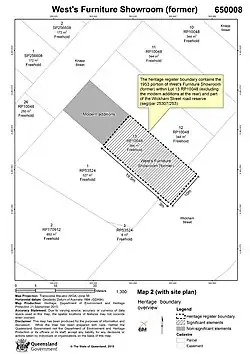 - ^ a b c d e f g h i j k l m n o p q r s t u v w x y z aa ab ac ad ae af ag ah ai aj ak al am an ao ap aq ar as "West's Furniture Showroom (former) (entry 650008)". Queensland Heritage Register. Queensland Heritage Council. Retrieved 16 February 2018.