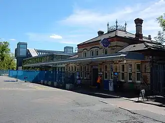 West Drayton station is on the original line of the Great Western Railway, and was opened on 4 June 1838 at the same time as the line.[2][3] The original station was located approximately 200 m (660 ft) to the west of the current station and was opened in its current position on 9 April 1884.[4] This was four months before the Staines and West Drayton Railway branch line was opened on 9 August 1884.[3][5] Initially trains operated as far as Colnbrook, with services to Staines commencing on 2 November 1885.[6] From 1 March 1883, the station was served by District Railway services running between Mansion House and Windsor. The service was discontinued as uneconomic after 30 September 1885.[7][8]