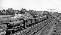 Originally the station consisted of four platforms in a staggered layout: platform 1 (along with a siding) and the island comprising platforms 2 and 3 to the west of the Drayton Green Road bridge, and platform 4 on the east side.[8] The station was located next to the London Co-operative Society's main creamery, and so was equipped with a dedicated milk train platform in the mid-1900s.