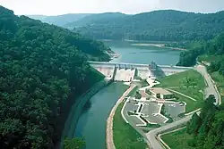 Three miles (4.8 km) south of Weston, the river is dammed by the U.S. Army Corps of Engineers to form Stonewall Jackson Lake. The project was authorized by the federal Flood Control Act of 1966 for flood control, improvement of water quality and water supply, improvement of habitat for fish and wildlife, hydropower, and recreation.[12] Construction of the dam was delayed by the opposition of local residents[3] and began in the mid-1980s at an ultimate cost of $208 million;[12] it became fully operational in 1988.[13] The dam is 95 feet (29 m) tall and forms a 2,650-acre (1,070 ha) lake, with a larger capacity during periods of flood.[12] Land along the lake is leased as a wildlife management area[14] and Stonewall Jackson Lake State Park.[15]