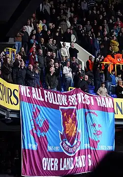 West Ham United F.C. supporters, commonly known as Hammers, are the followers of the London-based West Ham United Football Club, who were founded as Thames Ironworks in 1895. There are 700,000 fans on the club's database and over 2,300,000 likes on Facebook.[1] The club's website is in the top ten most visited websites for English football clubs by people in the USA.[2] Their fans are also associated with a once-notorious hooligan element[3] and have long-standing rivalries with several other clubs, most notably Millwall.