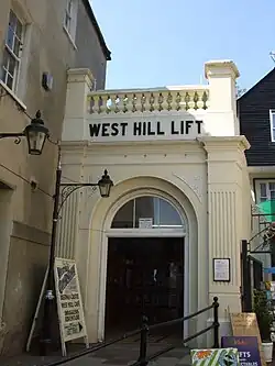 The West Hill Cliff Railway, or West Hill Lift, is a funicular railway located in the English seaside town of Hastings. It runs largely in tunnel, and provides access to Hastings Castle and St Clement's Caves from George Street, on the town's sea front. The West Hill overlooks the sea to the south, the Old Town to the east, and the current central business district of Hastings to the west.[1]