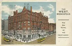The West hotel was situated on the southwest corner of the intersection of Hennepin Avenue and Fifth Street (the site currently occupied, in part, by the Shubert Theatre, moved there in 1999), in the center of a burgeoning entertainment district that started coming together in the 1880s and was a temporary home to such well-known public figures as Mark Twain and Winston Churchill. It also catered to delegates of the 1892 Republican National Convention (held at the Exposition Building across the Mississippi River). It was Minneapolis's largest and most luxurious hotel for many years after its construction.