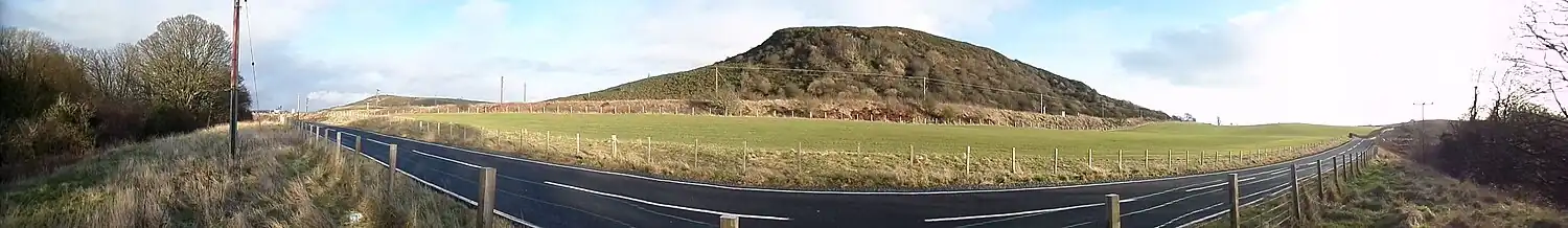 West Kilbride is situated on the west coast of Scotland, approximately 40 miles (60 kilometres) southwest of Glasgow, about 8 mi (13 km) south of Largs and about 5 mi (8 km) north of the "Three Towns" conurbation of Ardrossan, Saltcoats and Stevenston. The built-up area extends from Seamill on the coast of the Firth of Clyde to the principal part of the town, which, raised up and about 1 mi (1.5 km) from the coast, lies between Law Hill (168 m or 551 ft) and Tarbert Hill (138 m or 453 ft). It is overlooked by Cauldron Hill (329 m or 1,079 ft), whose name is largely reputed to be from the Welsh "Cadron" ref. Geoffrey of Monmouth. It looks across the Firth of Clyde to the mountains of the Isle of Arran to the west. The seafront at Seamill features a long sandy beach, as well as rocky outcrops including the small harbour at Portencross. The neighbouring agricultural land supports cereals, potatoes, and livestock, particularly sheep.