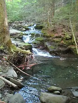 Just under 2,700 feet (820 m) in elevation, the terrain becomes gentler. At the town line between Hunter and Lexington, the two streams join.[7] The West Kill flows steadily downhill for its next half-mile (800 m) as the Devil's Path hiking trail, itself descending the mountain, gradually comes closer to the stream and follows it along its north side.[8]