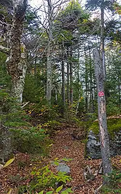 At Diamond Notch Falls, the Devil's Path merges briefly with the Diamond Notch Trail coming in from the west. The two cross the West Kill on a wooden bridge, the uppermost crossing of the stream. Just south of the stream, the trails again diverge, with the Devil's Path following the stream for a short distance on that side before beginning its ascent of West Kill Mountain to the southwest. The Diamond Notch Trail runs parallel to the kill for another 0.7 miles (1.1 km) to the trailhead parking lot, the eastern end of Greene County Route 6, known locally as Spruceton Road, at 2,220 feet (680 m) elevation.[8]