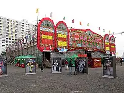 The West Kowloon Bamboo Theatre was built at the junction of Canton Road and Austin Road West (the present site of Xiqu Centre) in January 2012. It was the first cultural event organised by WKCDA to mark the launch of the design and construction stage of the district. Bamboo theaters were once a staple for honouring and celebrating the Chinese sea goddess Tin Hau and Zhen Jun. The event, which was a combination of traditional Cantonese opera, contemporary visual art installations and film shows in collaboration with the Chinese Artists Association of Hong Kong and involved various renowned visual artists, attracted over 12,000 participants in 7 days. The Bamboo Theatre was initially to be an annual event, but as of 2021 has not been recreated.