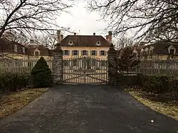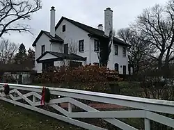 Advertising magnate Albert Lasker wished to build a home in Lake Forest proper, but the city was strict on property ownership from Jewish and African-American populations until it had "greatly diminished" by 1991.[5] As such, he built his home and property outside Lake Forest city limits. It would become "Mill Road Farm", a 700 acre estate designed by William Flynn and David Adler comprising a private golf course,[6] a working dairy farm, and over 25 buildings, including a gatehouse, a tack house, a milk house, dovecotes, a pool and cabana, a separate theatre, and the centerpiece, a main house.[7] 16 still stand today, and many are now private residences.[8] Lasker donated the property in the early 1940s to the University of Chicago and it was developed into a residential community in the 1960s, preserving most of the buildings.[9]