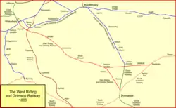 The GNR had repeatedly submitted parliamentary bills seeking authorisation for its own Doncaster to Wakefield line, and these had repeatedly been thrown out; the most recent was in 1861. Now in that year a new company was promoted, to be called the West Riding and Grimsby Railway, and in the 1862 parliamentary session it was authorised, on 7 August 1862, in the West Riding and Grimsby Railway Act 1862 (25 & 26 Vict. c. ccxi).[2] The logic of this apparent reversal of policy was that the line would give West Riding industries access to Grimsby docks, for export of their products. The project was sponsored by the South Yorkshire Railway and the Manchester, Sheffield and Lincolnshire Railway, although it was nominally independent. The authorised capital was £360,000, and the sponsoring companies guaranteed a dividend of 4+12% on the share capital.[1][3] The South Yorkshire Railway was leased by the MS&LR from 1864 and was already under its influence.[4] The MS&LR was friendly towards the Great Eastern Railway, which was trying to get access to the Yorkshire coal resources. This was a development that the GNR wished to prevent, and the possibility motivated the GNR to hasten the purchase, to keep the rival away.[5]