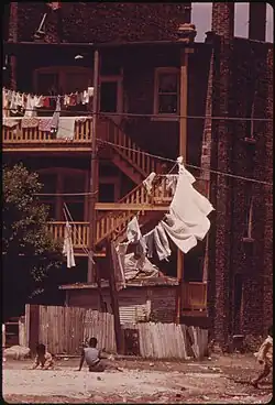 The West Side has gone through many transitions in its ethnic and socioeconomic makeup due to its historic role as a gateway for immigrants and migrants as well as its role for funneling poorer African-American residents away from the wealthier lakeside neighborhoods and central business district.[2] Historically the Great Chicago Fire of 1871 started on the West Side before consuming much of the then city, and Jane Addams of Hull House brought international attention to the West Side in the late 1900s and early 20th century. At the same time, some of Chicago's grandest parks and boulevards were laid out on the West Side. Today, the West Side consists of large mixed communities of middle class, working class, and low-income African American, Puerto Rican, and Mexican residents; some small communities of blue-collar, lower middle class and middle class white residents of historically Polish, Italian, Czech, Russian Jewish, and Greek, descent; and newer communities of middle-class, upper-middle class, and wealthy white residents created by gentrification.[3] Major shifts continue to happen due to forces such as rapid gentrification, selective corporate investments, and unequal distribution of city resources.[4][5]