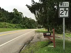 West Virginia Route 27 is an east–west state highway located within the northern panhandle county of Brooke in West Virginia. The western terminus of the route is at West Virginia Route 2 in Wellsburg. The eastern terminus is at the Pennsylvania state line 5 miles (8 km) east of Wellsburg, where WV 27 continues east into the border town of Independence as Pennsylvania Route 844.