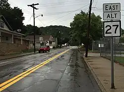 West Virginia Route 27 Alternate is an east–west state highway located within the northern panhandle county of Brooke in West Virginia. The western terminus of the route is at West Virginia Route 2 in Follansbee. The eastern terminus is at the Pennsylvania state line near Eldersville, Pennsylvania, where the road continues as Eldersville Road (State Route 4014).