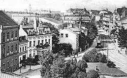 The outbreak of the World War I initially brought little change. On August 6, 1914, the company discontinued Line M, which had been established shortly before. The construction of Entlastungsstrecke der Hochbahn between the stations Gleisdreieck and Nollendorfplatz necessitated the removal of the streetcar from Motzstraße and Kurfürstenstraße; lines A, BH and BS were rerouted via Bülowstraße. A few months later, the WBV discontinued the BH line and shortened the BS line to the Potsdamer Platz - Roseneck via Schmargendorf route; in the course of 1917, it was again designated line B.[6] From November 15, 1916, Line L ran via Lützowplatz instead of via Lichtensteinallee. Line G was withdrawn from Roseneck to the Wilmersdorf municipal cemetery on February 15, 1917, with line 57 of the GBS taking over service to Hohenzollerndamm.[5]