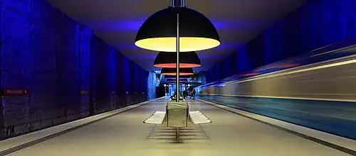 . Because of its lighting design, it is occasionally used as a photo motif by advertising agencies and the special atmosphere has also been used as a record cover.[3] The light comes from eleven lamps, each 3.80 metres in diameter, which have luminaires in blue, red and yellow.[4] At the western end sunlight falls in. This divides the platform into different colours. Together with the rough walls, the station is reminiscent of a cave. Originally, the architect had planned a glass pane in front of the walls, but he liked it better that way. However, the walls had to be secured with a steel net in 2003, as individual pieces had loosened from the wall time and again. The barrier storey can be reached by rolling stairs, fixed staircases and a lift. From there you can also get to the surface by means of rolling and fixed stairs and a lift, where there is a connection to the tram line