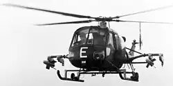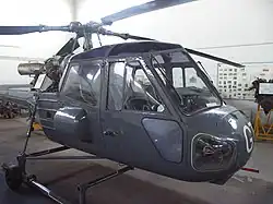 Behind the two front seats was a three-seat bench, although this could be replaced with a four-seat bench when fitted with modified rear doors. It was used for general light work, including observation, liaison, training and search & rescue. When fitted as a light attack helicopter, it carried either two, skid-mounted, forward-firing machine gun (L8A1 General Purpose Machine Gun) packs or a single pintle-mounted machine gun in the rear cabin.[4] The pintle mount was available in both port and starboard mountings.[5] The gun-packs, which were both aimed at a pre-set convergence angle, carried 200 rounds of ammunition and were mounted on a tubular spar that was fixed between the front and rear undercarriage legs.[6] In the anti-tank role, it could carry four guided missiles (the Nord SS.11).[7] The sighting unit was the AF.120, the result of a joint venture between Avimo and Ferranti, had x2.5 and x10 magnification.[8] The APX Bezu sight unit was also evaluated but rejected, although it was adopted for use on the Westland Wasp.