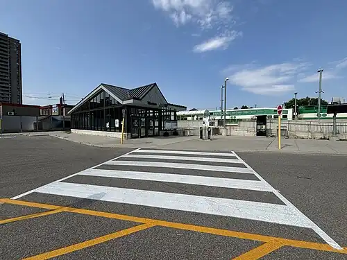 The station is fully accessible, with pedestrian entrances from Weston Road and Lawrence Avenue and a pedestrian bridge across Lawrence Avenue. The station includes a kiss and ride passenger drop off area,[2] and has a parking capacity for 220 cars.[3]
