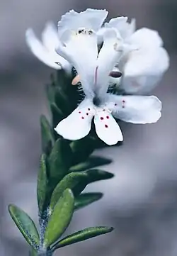 | Westringia kydrensis flower, showing the red dots on the lobes | |
