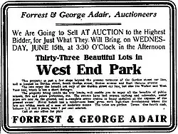 Nevertheless, Westwood Park never materialized beyond land preparation.[6] It was not until 1910 when William J. Davis bought portions of the Ontario Land Company parcel and hired civil engineer and landscape expert Solon Zachery Ruff (who also designed the Ansley Park neighborhood) to turn the area into a "residence park" known as West End Park.[5] Streets in West End Park included East and West Ontario Avenue, Ontario Avenue, Willard Avenue, and the eastern portions of Stokes Avenue, South Gordon Street, Westwood Avenue, and Rogers Avenue. Davis continued to improve the land by laying water mains, gas mains, and adding cemented sidewalks before auctioning off subdivided parcels of land through Forrest and George Adair,[7] leading to the construction and population of West End Park.