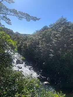 The river starts where the Whakapapaiti and Whakapapanui streams meet. They both run from Ruapehu and are joined by several other streams.[3] These include the Waikare and Tawhai streams that join the Whakapapaiti stream before its confluence to form the river.[17] The 13 m (43 ft) tall Tawhai Falls are on the Whakapapanui stream, rather than the Tawhai stream and are accessible by a walking track from the Bruce Road.[18] The upper stream catchment has had several lahars run down them in the last 10,000 years, including 1969 and 1975.[19] There was a major sector collapse without eruption of Ruapehu about 9500 years ago that impacted on the upper catchment.[17]